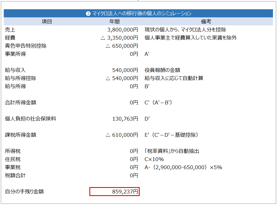 ③マイクロ法人への移行後の個人のシミュレーション